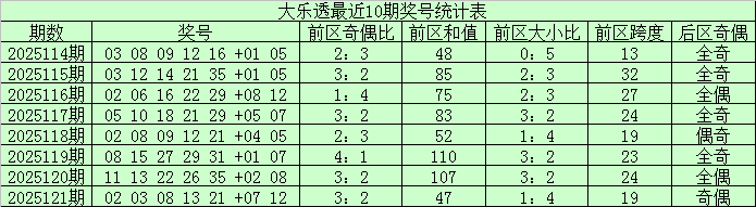 大乐透第25121期奖号为:02、03、08、13、21+07、12。其中前区和值为47,奇偶比为3:2,大小比为1:4。后区开出全大、一奇一偶组合。