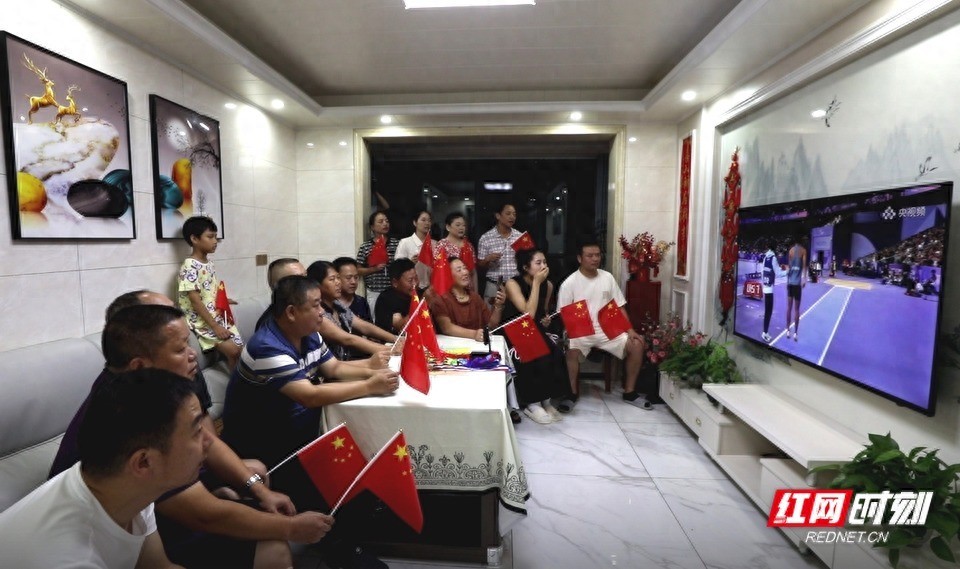 凌晨1点,陈世昌家中灯火明后,九故十亲都聚一堂,挥舞国旗,为陈世昌饱读劲加油。