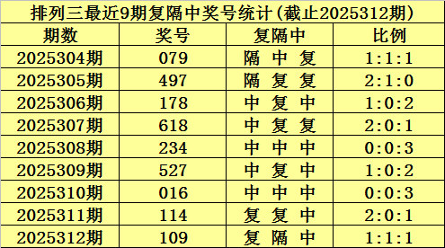上期回首:罗列三第2025312期奖号为:109。大小比为1:2,奇偶比为2:1,012路比为2:1:0。