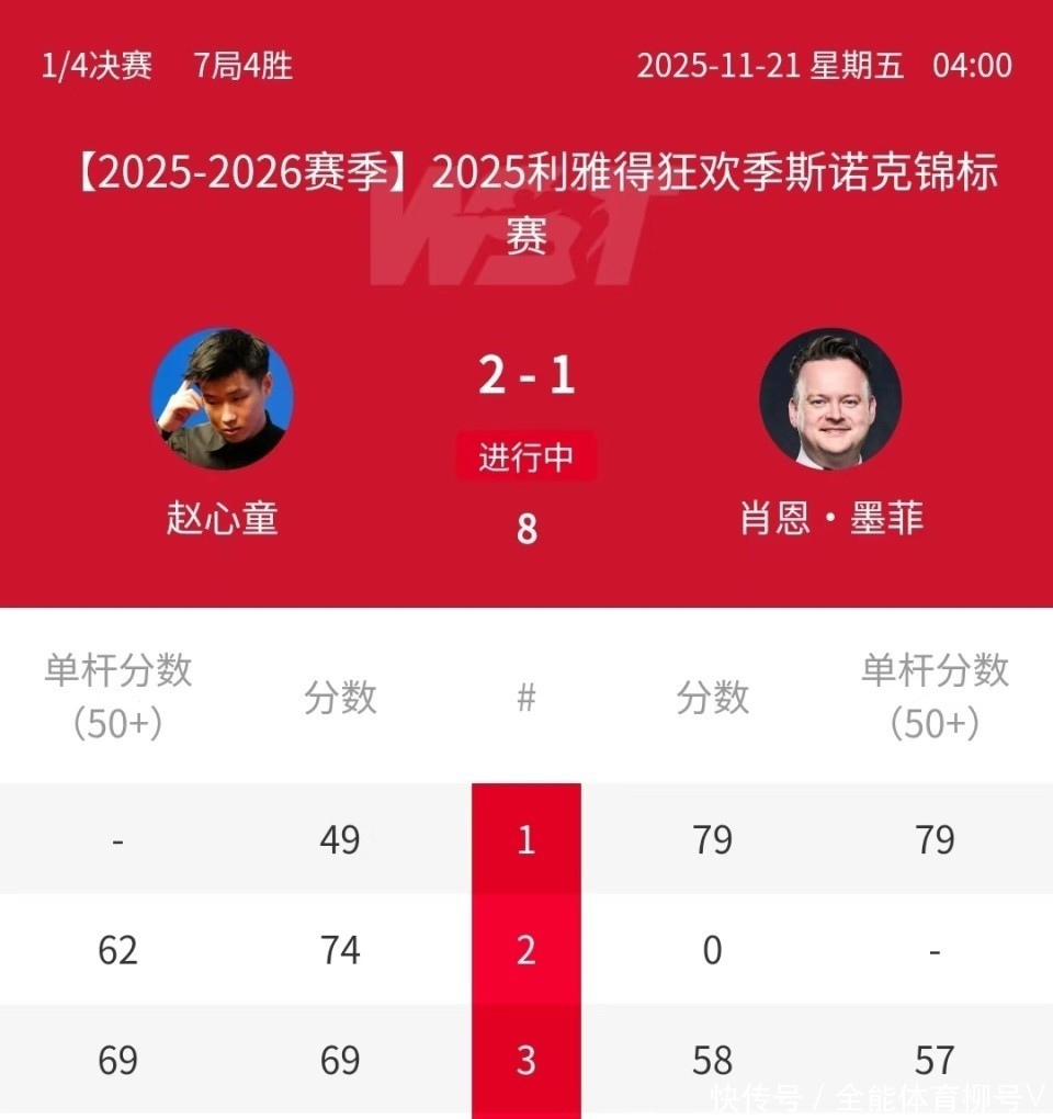 北京时辰11月21日凌晨,2025年斯诺克利雅得“金球”狂欢季锦标赛不时进行。正在进行的1/4决赛的一场焦点比赛中,本年世锦赛冠军赵心童在第三局舍弃后,以2-1反超“魔术师”肖恩-墨菲。前两轮,墨菲以2个4-0打进8强。