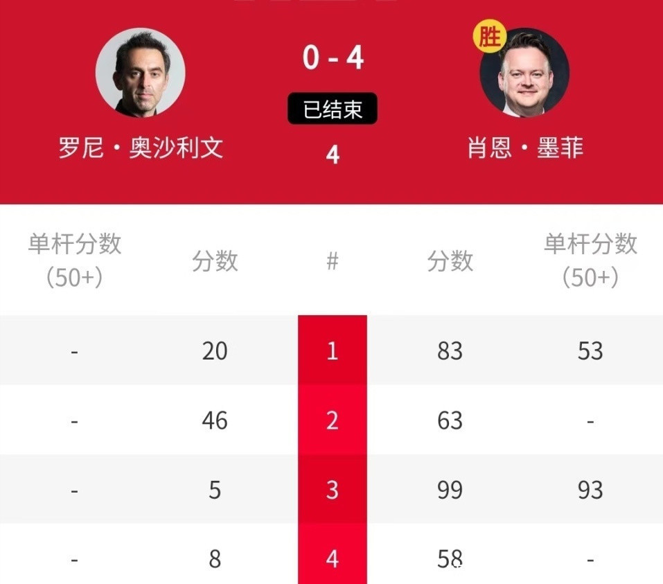从比赛将进度来看,墨菲赢得特别毛糙,四局比分为:83(55)-22、128(128)-0、65-0、125(109)-4。而在4-0零封皆亚德-卡巴尼后,墨菲在第二轮迎战老敌手奥沙利文。效果以4-0得胜晋级。