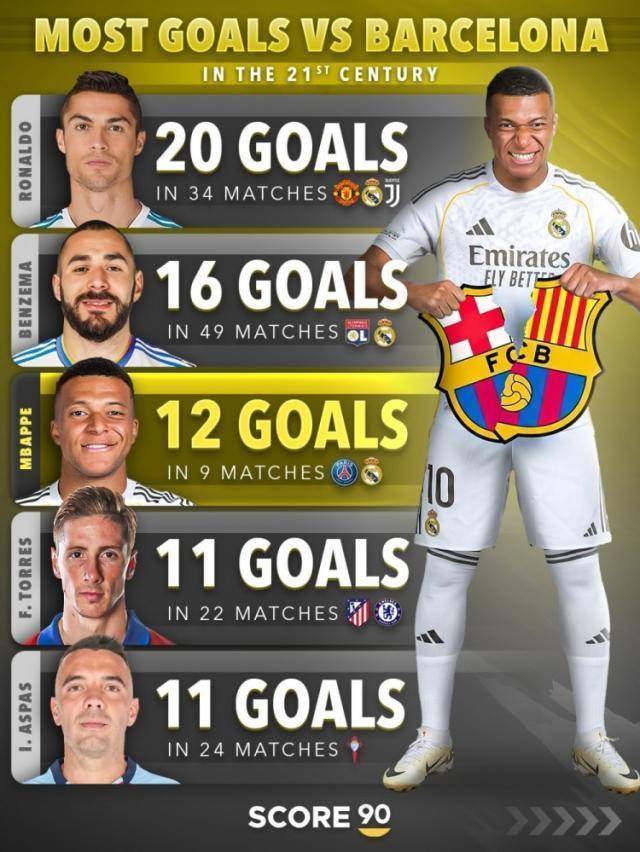 北京期间1月12日凌晨,皇马将在西超杯决赛中对阵巴萨。Score90统计了本世纪球员对阵巴萨的进球数目,C罗、本泽马、姆巴佩排行前三。本世纪对阵巴萨进球榜: